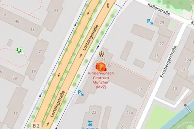 Über die Landsberger Straße auf die Josef-Felder-Straße (Nordumgehung Pasing), dann geradeaus weiter auf die Lortzingstraße, linkerhand liegt weithin erkennbar das Kinderwunsch Centrum München mit dem Haupteingang und der Zufahrt zur Tiefgarage.